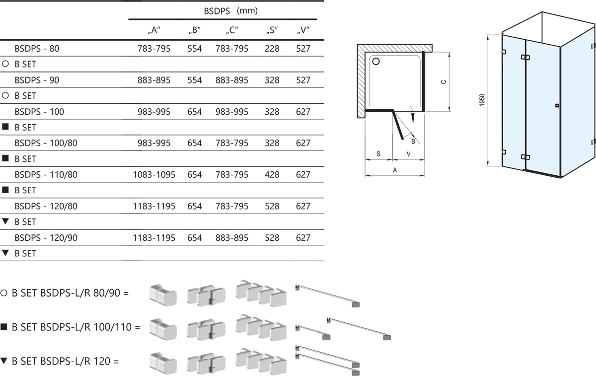 Výrobok sa skladá zo sprchových dverí dvojdielnych (s jedným pevným dielom as jedným pohyblivým, ktorý tvorí otočné dvere) az pevnej steny jednodielnej. Ľavý alebo pravý variant výrobku je daný umiestnením pantov otočných dverí pri pohľade zvončeka. Zdvihový mechanizmus zabezpečí aretáciu dverí v základnej polohe, ich automatické dovieranie a nadvihnutie nad prahovú lištu pri otváraní. Montuje sa do obloženého rohu kúpeľne na vaničky Ravak Gigant Pro, Gigant Pro Chrome alebo priamo na podlahu so zabudovaným odtokovým žľabom či podlahovým vpustom. Sprchový kout BSDPS je dodávaný v zložení: sklenený kout v jednom balení. V druhom balení (B SET) sú kovové časti. Obe časti výrobku je nutné objednať samostatne (sklá + B SET) alebo v sete.