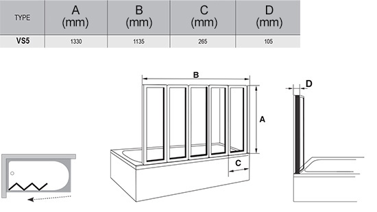 Zástena sa skladá z piatich pohyblivých dielov, ktoré je možné úplne zložiť (tzv. „harmonika“) do vnútorného priestoru nad vaňu. Vďaka úzkym výplniam zostane po zložení zásteny na okraji vane najviac miesta. Vaňovú zástenu je možné inštalovať k obdĺžnikovým vaniam (Classic, Classic II, Vanda II) alebo na akúkoľvek klasickú obdĺžnikovú vaňu s rovným horným lemom. Štandardná výška zásteny je 1330 mm. Vaňová zástena VS5 má v zloženom stave šírku 223 mm. Otočením vaňovej zásteny VS5 o 180⁰ získame variant vstupu sprava alebo zľava.